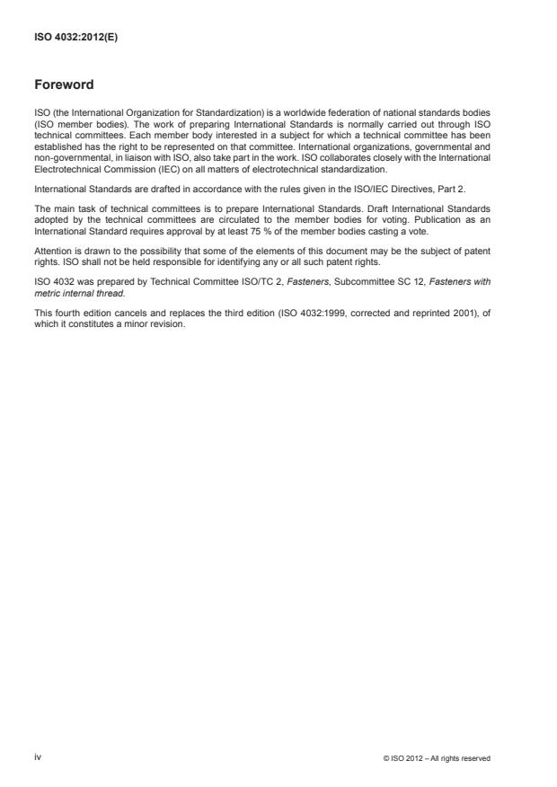 ISO 4032 was prepared by Technical Committee ISO/TC 2, Fasteners, Subcommittee SC 12, Fasteners with