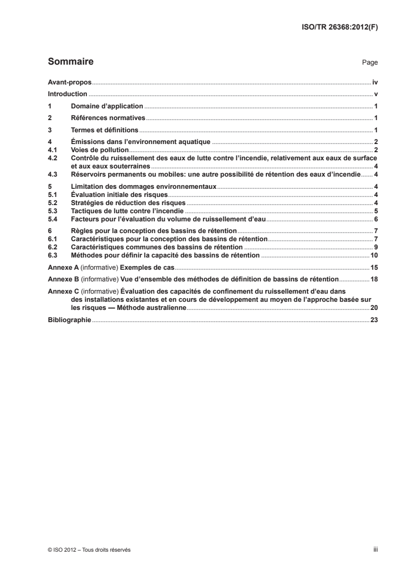ISO/TR 26368:2012 is a technical report published by the International Organization for Standardization (ISO). Its full title is "Environmental damage limitation from fire-fighting water run-off". This standard covers: This Technical Report provides information for the development of specifications and procedures aimed at limiting adverse environmental impacts caused by fire-water run-off (see References [2] to [7]). The information is applicable to commercial facilities, such as warehouses, chemical storage facilities, refineries, process plants which handle and/or store products with a potential pollution potency, and vehicles for the transport of such substances. It is only applicable to land-based operations (i.e. not oil tankers or off-shore oil drilling platforms), and to wildland fires. As such, this Technical Report provides a summary of current potential approaches for controlling and eliminating adverse environmental impacts caused by fire-fighting water run-off. It offers relevant information for the design and sizing of water basins to limit the dispersion of contaminated water into the environment at large (see References [8] to [12]). This Technical Report is divided into three main parts: a description of the hazards of fire run-off, environmental damage limitation and details concerning the possible design of water basins.