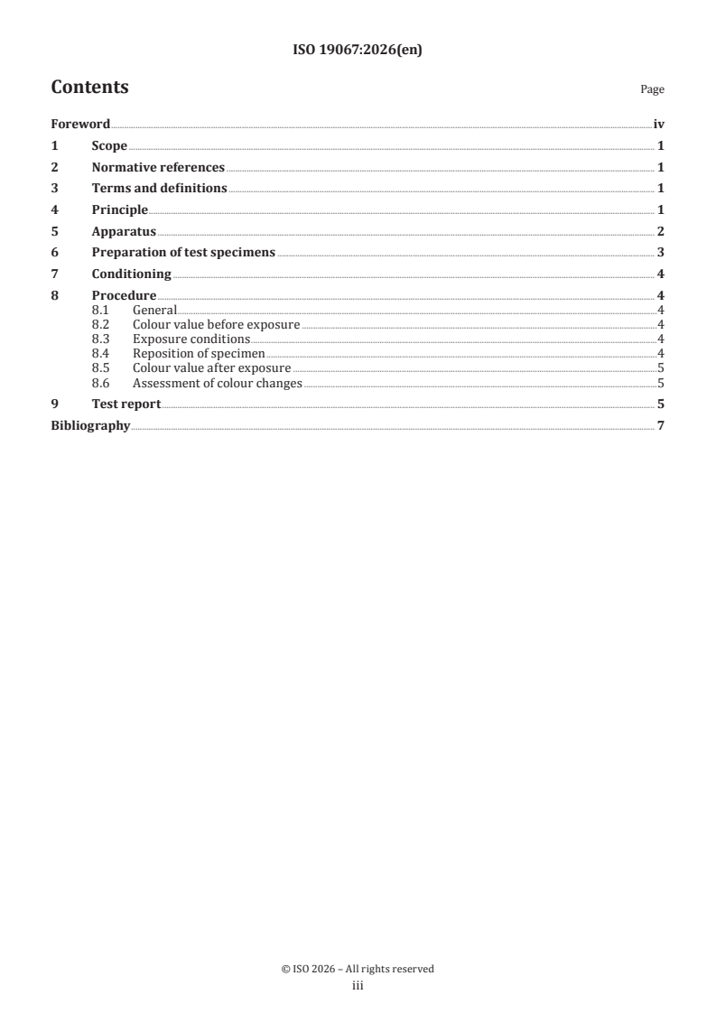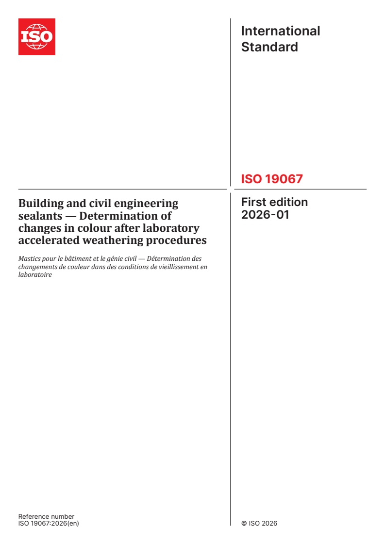 ISO 19067:2026 is a standard published by the International Organization for Standardization (ISO). Its full title is "Building and civil engineering sealants — Determination of changes in colour after laboratory accelerated weathering procedures". This standard covers: This document specifies a method for the determination of the changes in colour of opaque sealants after laboratory accelerated weathering procedures using artificial light sources. This document is not applicable to metallic, pearlescent, translucent or transparent sealants.