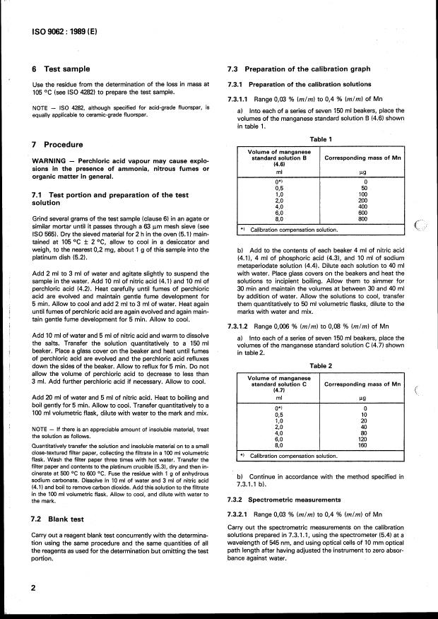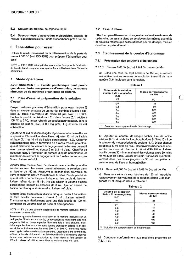 ISO 9062:1989 is a standard published by the International Organization for Standardization (ISO). Its full title is "Acid-grade and ceramic-grade fluorspar — Determination of manganese content — Periodate spectrometric method". This standard covers: Acid-grade and ceramic-grade fluorspar — Determination of manganese content — Periodate spectrometric method