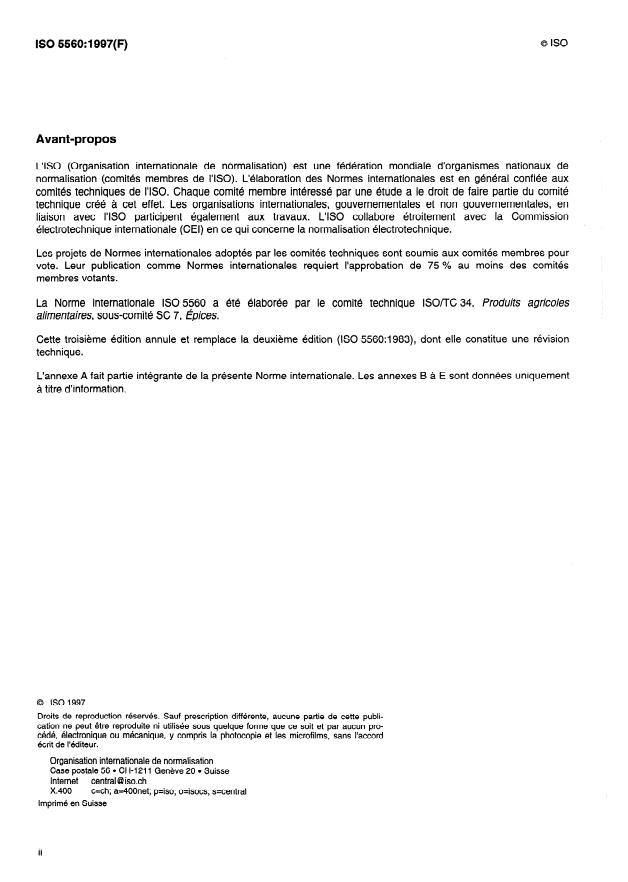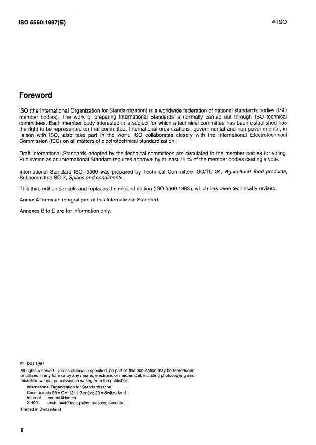 IS0 5560: 1997(E) Foreword IS0 (the International Organization for Standardization) is a worldwide federation of national standards bodies (IS0 member bodies). The work of preparing International Standards is normally carried out through IS0 technical committees. Each member body interested in a subject for which a technical committee has been established has the right to be represented on that committee. International organizations, governmental and non-governmental, in liaison with ISO, also take part in the work. IS0 collaborates closely with the International Electrotechnical Commission (IEC) on all matters of electrotechnical standardization. Draft International Standards adopted by the technical co mmittees are circul ated to the member bodies for voting. Publication as an I nternational Standard requi res approval by at least 75 % of the member bodies casting a vote. International Standard IS0 5560 was prepared by Technical Committee ISO/TC 34, Agricultural food products, Subcommittee SC 7, Spices and condiments. This third edition cancels and replaces the second edition (IS0 5560:1983), which has been technically revised. Annex A forms an integral part of this International Standard. Annexes B to E are for information only. 0 IS0 1997 All rights reserved. Unless otherwise specified, no part of this publication may be reproduced or utilized in any form or by any means, electronic or mechanical, including photocopying and microfilm, without permission in writing from the publisher. International Organization for Standardization Case postale 56 l Cl-l-121 1 Geneve 20 l Switzerland Internet central @ iso.ch x.400 c=ch; a=400net; p=iso; o=isocs; s=central Printed in Switzerland ii SIST ISO 5560:1998