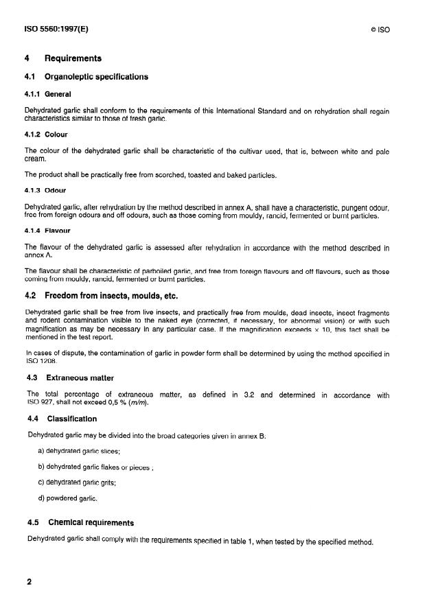 IS0 5560:1997(E) @ IS0 4 Requirements 4.1 Organoleptic specifications 4.1 .l General Dehydrated garlic shall conform to the requirements of this International Standard and on rehydration shall regain characteristics similar to those of fresh garlic. 4.1.2 Colour The colour of the dehydrated garlic shall be characteristic of the cultivar used, that is, between white and pale cream. The product shall be practically free from scorched, toasted and baked particles. 4.1.3 Odour Dehydrated garlic, after rehydration by the method described in annex A, shall have a characteristic, pungent odour, free from foreign odours and off odours, such as those coming from mouldy, rancid, fermented or burnt particles. 4.1.4 Flavour The flavour of the dehydrated garlic is assessed after rehydration in accordance with the method described in annex A. The flavour shall be characteristic of parboiled garlic, and free from foreign flavours and off flavours, such as those coming from mouldy, rancid, fermented or burnt particles. 4.2 Freedom from insects, moulds, etc. Dehydrated garlic shall be free from live insects, and practically free from moulds, dead insects, insect fragments and rodent contamination visible to the naked eye (corrected, if necessary, for abnormal vision) or with such magnification as may be necessary in any particular case. If the magnification exceeds x 10, this fact shall be mentioned in the test report. In cases of dispute, the contamination of garlic in powder form shall be determined by using the method specified in IS0 1208. 4.3 Extraneous matter The total percentage of extraneous matter, as defined in 3.2 and determined in accordance with IS0 927, shall not exceed 0,5 % (m/m). 4.4 Classification Dehydrated garlic may be divided into the broad categories given in annex B: a) dehydrated garlic slices; b) dehydrated garlic flakes or pieces ; c) dehydrated garlic grits; d) powdered garlic. 4.5 Chemical requirements Dehydrated garlic shall comply with the requirements specified in table 1, when tested by the specified method. 2 SIST ISO 5560:1998