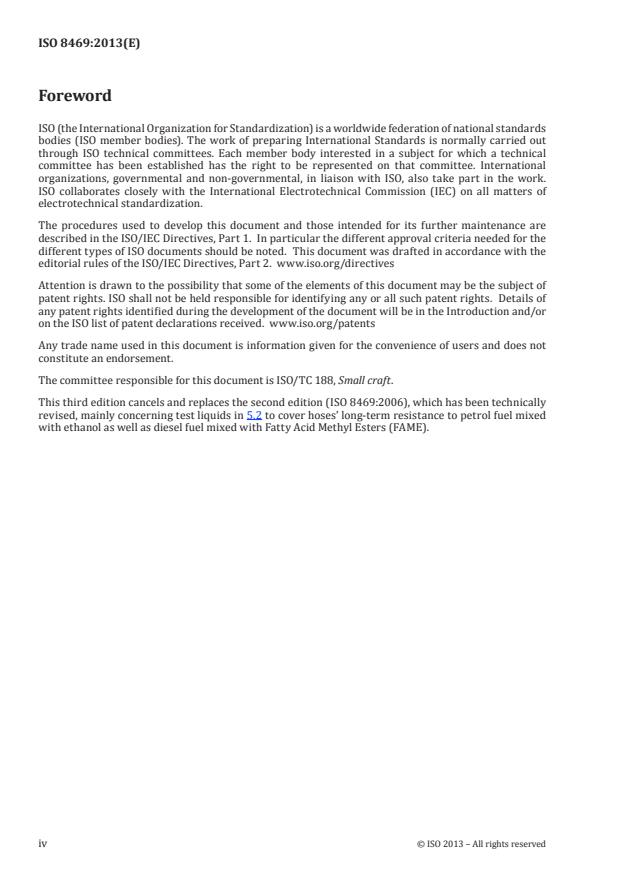 ISO 8469:2013 specifies general requirements and physical tests for non-fire-resistant hoses for conveying petrol or petrol blended with ethanol and diesel fuel or diesel fuel blended with FAME, designed for a working pressure not exceeding 0,34 MPa for hoses with inner diameter up to and including 10 mm and 0,25 MPa for hoses up to 63 mm inner diameter in craft of hull length up to 24 m. It applies to hoses for small craft with permanently installed fuel systems. Specifications for fire-resistant hoses are given in ISO 7840. Specifications for permanently installed fuel systems are given in ISO 10088.
