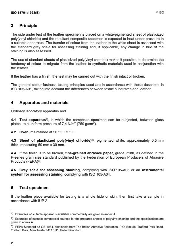 ISO 15701:1998 - Leather -- Tests for colour fastness -- Colour fastness to migration into plasticized poly(vinyl chloride)