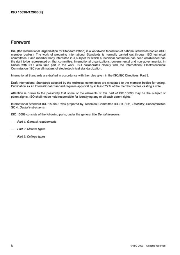 ISO 15098-3:2000 is a standard published by the International Organization for Standardization (ISO). Its full title is "Dental tweezers — Part 3: College types". This standard covers: Dental tweezers — Part 3: College types