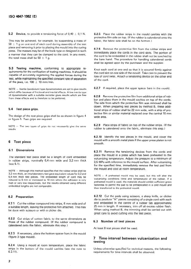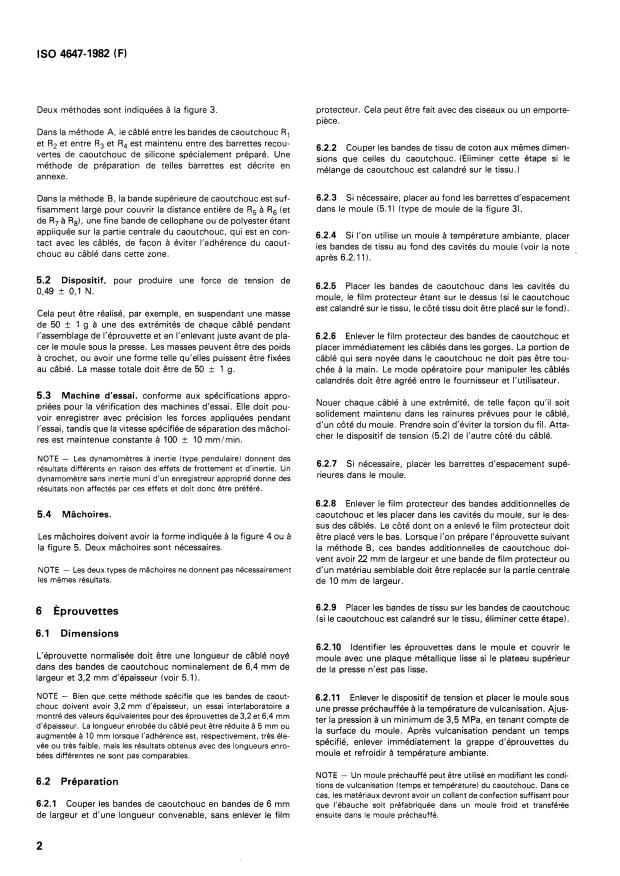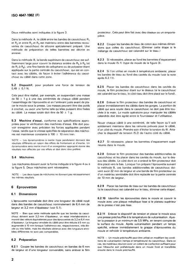ISO 4647:1982 is a standard published by the International Organization for Standardization (ISO). Its full title is "Rubber, vulcanized — Determination of static adhesion to textile cord — H-pull test". This standard covers: Specifies principle, materials, apparatus, test piece, time-interval between vulcanization and testing, conditioning of the test piece, test temperature and procedure of the subject mentioned. An annex refers to the preparation of silicone-rubber-faced bars and contains several figures.