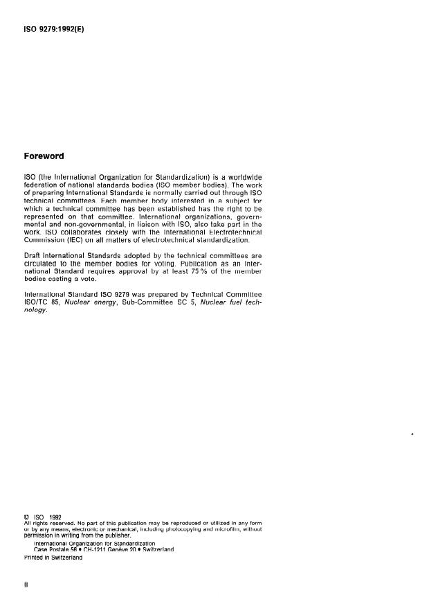 ISO 9279:1992 is a standard published by the International Organization for Standardization (ISO). Its full title is "Uranium dioxide pellets - Determination of density and total porosity - Mercury displacement method". This standard covers: Describes the principle, the apparatus, the procedure, the expression of results and the contents of the test report.