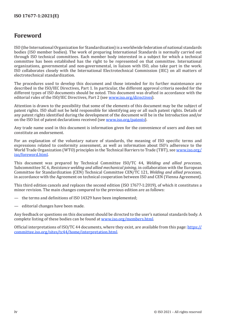 ISO 17677-1:2021 is a standard published by the International Organization for Standardization (ISO). Its full title is "Resistance welding - Vocabulary - Part 1: Spot, projection and seam welding". This standard covers: This document establishes a vocabulary of terms and definitions for resistance spot welding, projection welding and seam welding. NOTE In addition to terms used in English and French, two of the three official ISO languages, this document gives the equivalent terms in German; these are published under the responsibility of the member body for Germany (DIN). However, only the terms and definitions given in the official languages can be considered as ISO terms and definitions.