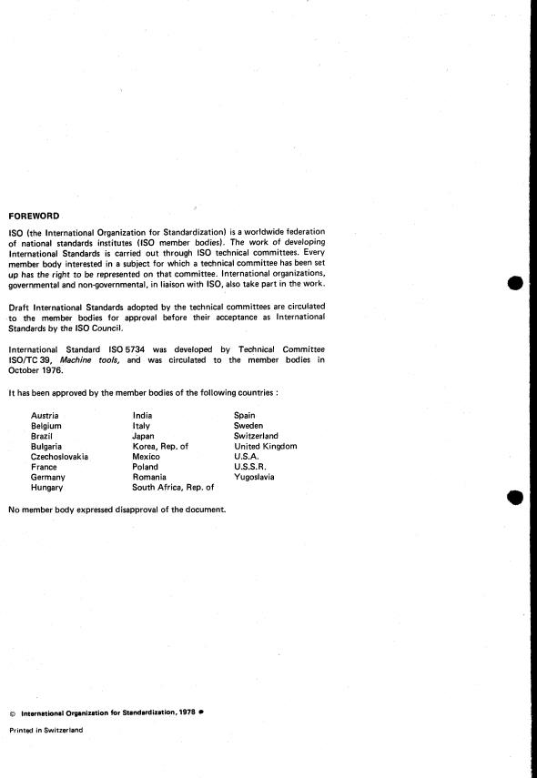 ISO 5734:1978 is a standard published by the International Organization for Standardization (ISO). Its full title is "Test conditions of mechanical dividing heads for machine tools — Testing of the accuracy". This standard covers: Test conditions of mechanical dividing heads for machine tools — Testing of the accuracy