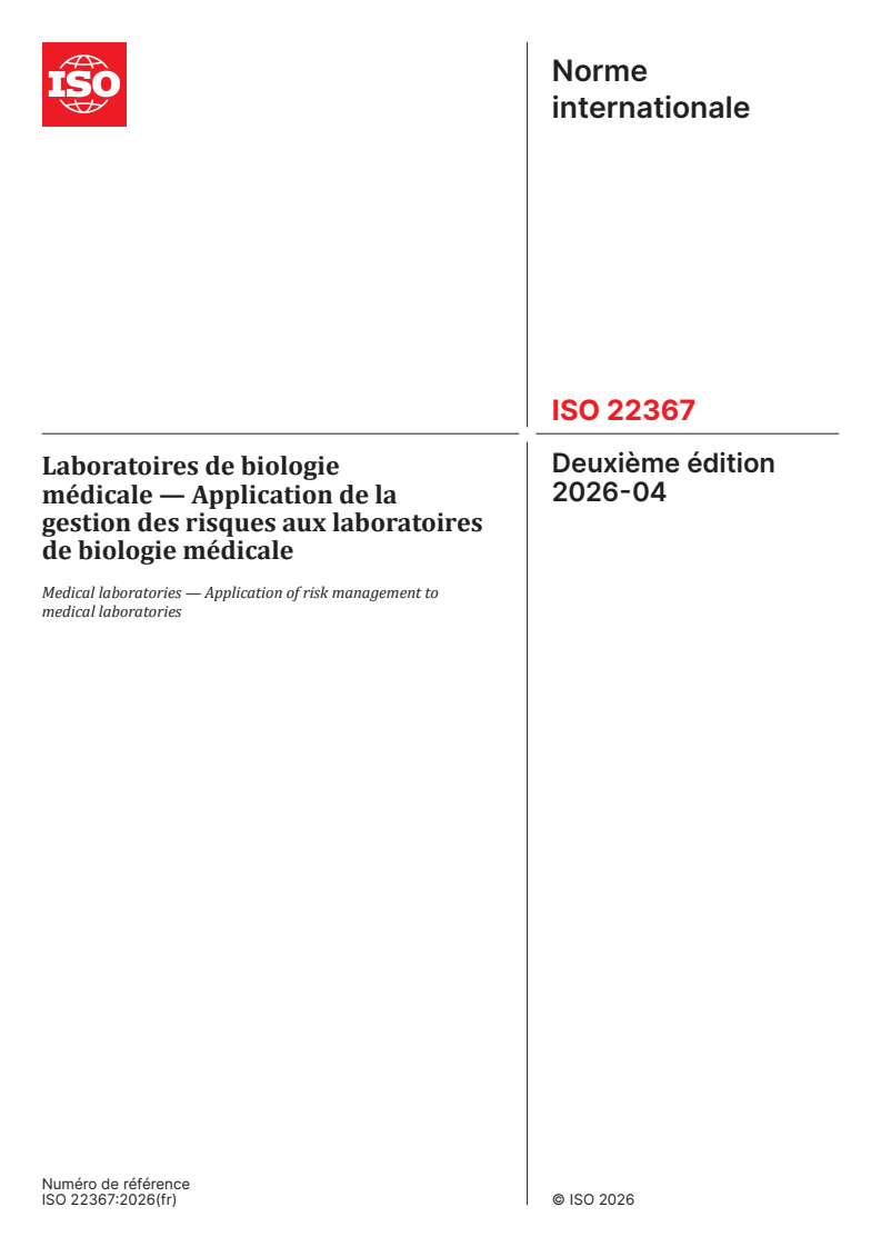 ISO 22367:2026 - Laboratoires de biologie médicale — Application de la gestion des risques aux laboratoires de biologie médicale
