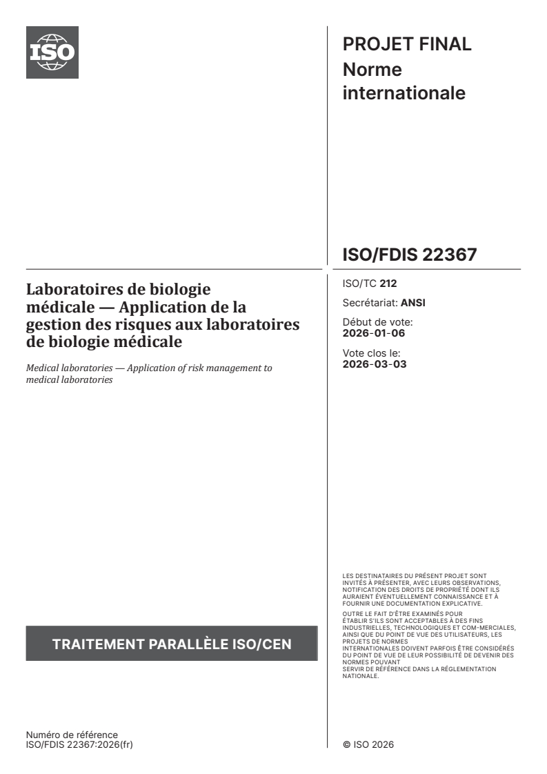 ISO/FDIS 22367 - Laboratoires de biologie médicale — Application de la gestion des risques aux laboratoires de biologie médicale Released:27. 01. 2026
