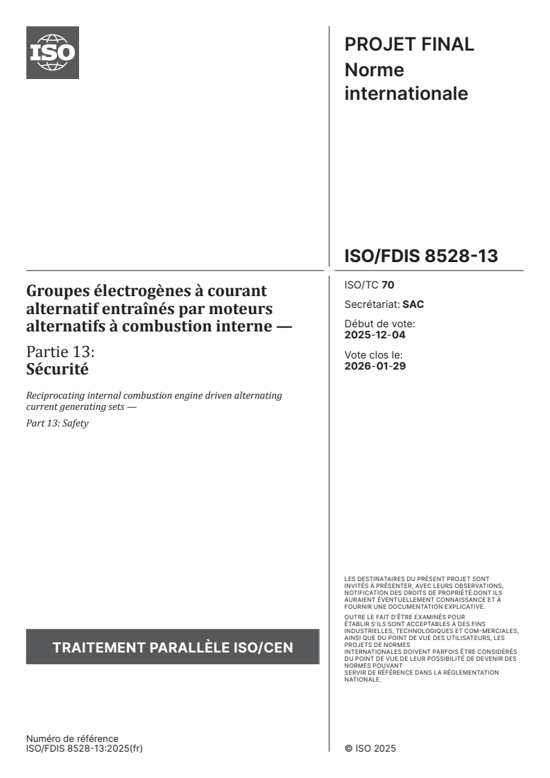 ISO/FDIS 8528-13 - Reciprocating internal combustion engine driven alternating current generating sets — Part 13: Safety Released:12/3/2025