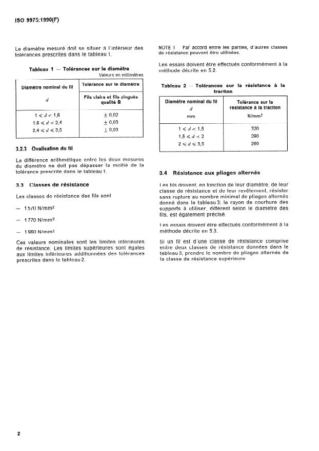 Specifies: a) the dimensional tolerances; b) the mechanical characteristics; c) the conditions with which coatings, if any, shall comply; d) the conditions of sampling and control. Applies to round, bright or zinc-coated wires of nominal diameters between 1 mm and 3,5 mm.