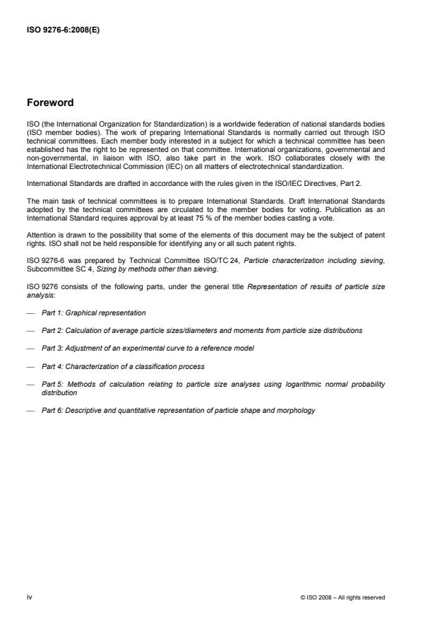 ISO 9276-6:2008 is a standard published by the International Organization for Standardization (ISO). Its full title is "Representation of results of particle size analysis - Part 6: Descriptive and quantitative representation of particle shape and morphology". This standard covers: ISO 9276-6:2008 specifies rules and nomenclature for the description and quantitative representation of particle shape and morphology. To achieve a more comprehensive description of a particle or particle system, particle size information can be used together with other information but, in most cases, the particle size information cannot be replaced. The averaging of shape over all particles in a sample has been shown to be an ineffective approach. Distributions of other particle characteristics are required in addition to particle size distributions (see ISO 9276‑1). The relevance, to technological applications, of any method of representing particle shape is the deciding factor in its use. Therefore this part of ISO 9276 is restricted to methods which can be correlated with physical properties in industrial applications. The aim of particle analysis is to determine the most appropriate characterization method for a particular application. This implies a profound understanding of the relationship between particle characteristics and macroscopic product and process properties (or at least a database of broad empirical data). Problems of shape and morphology would normally be three-dimensional problems, but most definitions in this part of ISO 9276 are in fact given for two dimensions because of the widespread use of image analysis methods.