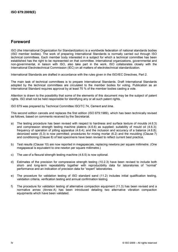 ISO 679:2009 specifies a method of determining the compressive and, optionally, the flexural strength of cement mortar containing one part by mass of cement, three parts by mass of ISO standard sand and one half part of water. ISO 679:2009 applies to common cements and to other cements and materials, the standards for which call up this method. ISO 679:2009 might not apply to other cement types that have, for example, a very short initial setting time. ISO 679:2009 describes the reference equipment and procedure and specifies the method used for validation testing of ISO standard sands and of alternative equipment and procedures.