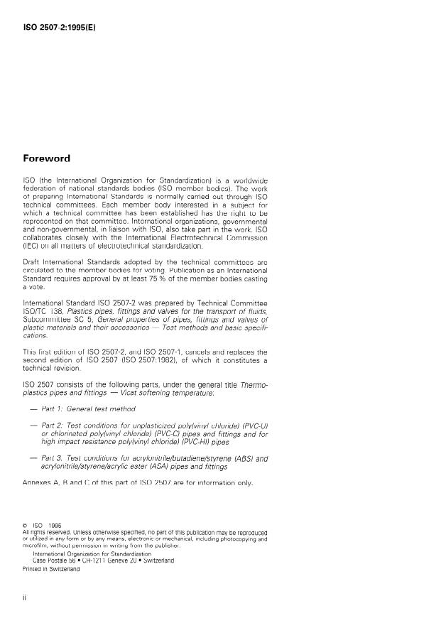 Keywords: ISO 2507-2:1995, Vicat softening temperature, PVC-U, PVC-C, PVC-HI, thermoplastics pipes, test conditions, pipe fittings, VST, material specification.