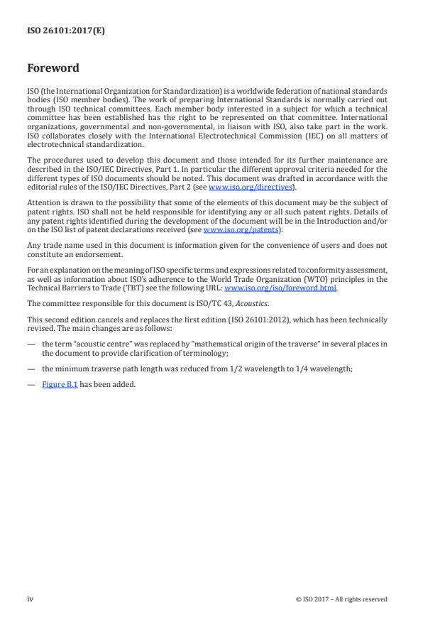 ISO 26101:2017 is a standard published by the International Organization for Standardization (ISO). Its full title is "Acoustics — Test methods for the qualification of free-field environments". This standard covers: ISO 26101:2017 specifies methodology for qualifying acoustic spaces as anechoic and hemi-anechoic spaces meeting the requirements of a free sound field. ISO 26101:2017 specifies discrete-frequency and broad-band test methods for quantifying the performance of anechoic and hemi-anechoic spaces, defines the qualification procedure for an omni-directional sound source suitable for free-field qualification, gives details of how to present the results and describes uncertainties of measurement. ISO 26101:2017 has been developed for qualifying anechoic and hemi-anechoic spaces for a variety of acoustical measurement purposes. It is expected that, over time, various standards and test codes will refer to this document in order to qualify an anechoic or hemi-anechoic space for a particular measurement. In the absence of specific requirements or criteria, Annex A provides qualification criteria and measurement requirements to qualify anechoic and hemi-anechoic spaces for general purpose acoustical measurements. ISO 26101:2017 describes the divergence loss method for measuring the free sound field performance of an acoustic environment.