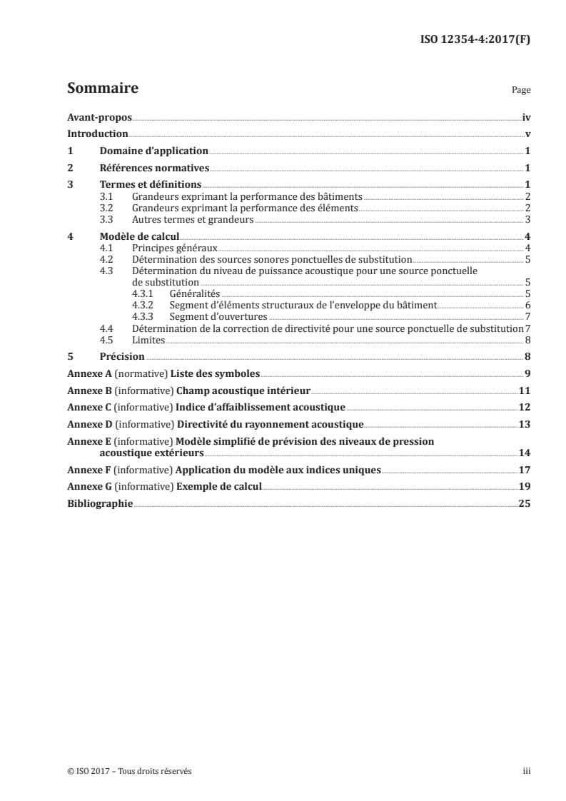 - Informative annexes: Symbols (A), interior sound field (B), sound reduction index (C), directivity (D), simplified exterior level prediction (E), single-number rating application (F), and a worked calculation example (G).
