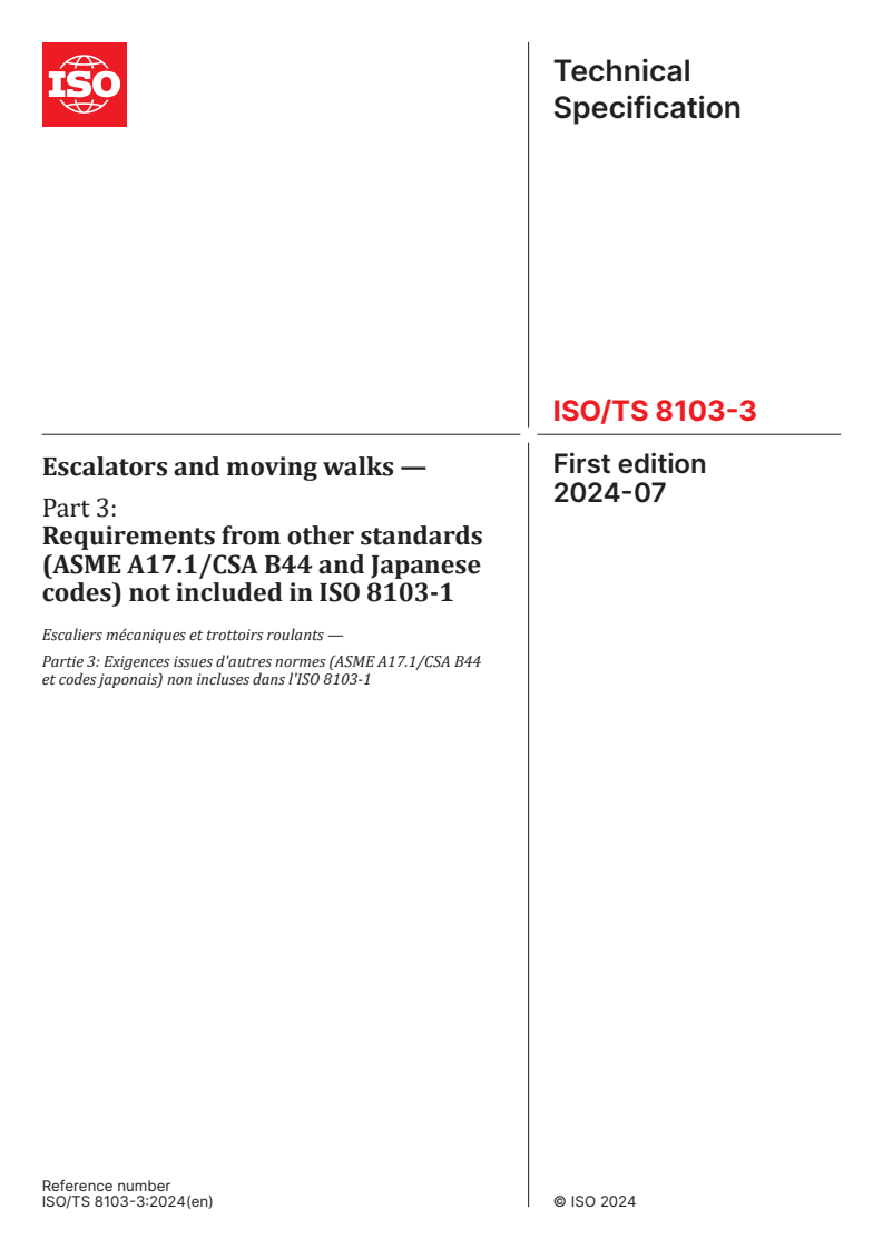 ISO/TS 8103-3:2024 - Escalators and moving walks — Part 3: Requirements from other standards (ASME A17.1/CSA B44 and Japanese codes) not included in ISO 8103-1 Released:7/9/2024