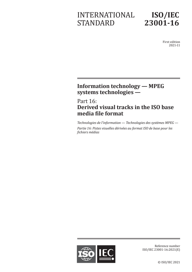 ISO/IEC 23001-16:2021 - Information technology — MPEG systems technologies — Part 16: Derived visual tracks in the ISO base media file format Released:11/19/2021
