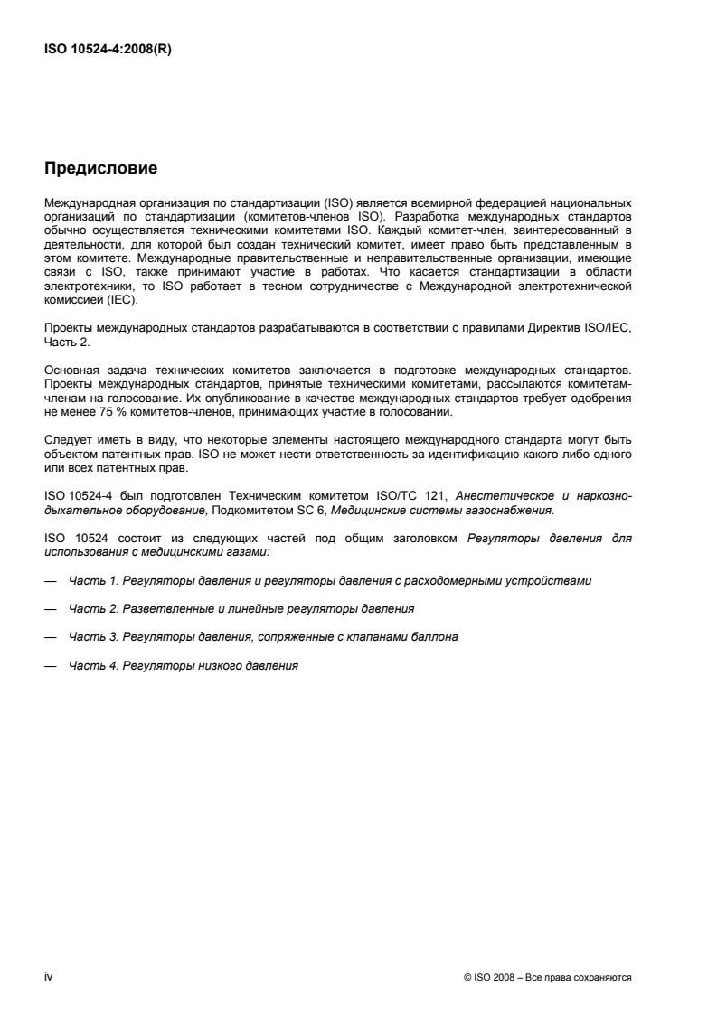 ISO 10524-4:2008 is a standard published by the International Organization for Standardization (ISO). Its full title is "Pressure regulators for use with medical gases - Part 4: Low-pressure regulators". This standard covers: ISO 10524-4:2008 applies to the types of low-pressure regulators listed below and intended to be used with the following medical gases in the treatment, management, diagnostic evaluation and care of patients: oxygen; nitrous oxide; medical air; helium; carbon dioxide; xenon; specified mixtures of the gases listed above; air for driving surgical tools; nitrogen for driving surgical tools; oxygen-enriched air. The types of low-pressure regulators covered by ISO 10524-4:2008 are as follows: low-pressure regulators intended to be connected to terminal units of medical gas pipeline systems complying with ISO 7396-1; low-pressure regulators with integral flow-metering devices intended to be connected to terminal units of medical gas pipeline systems complying with ISO 7396-1; low-pressure regulators intended to be connected to terminal units attached to pressure regulators complying with ISO 10524-1 or ISO 10524-3; operator-adjustable low-pressure regulators for air or nitrogen for driving surgical tools that are an integral part of a medical gas pipeline system complying with ISO 7396-1.