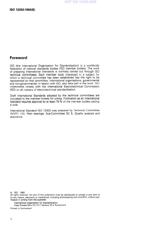 ISO 12302:1993 is a standard published by the International Organization for Standardization (ISO). Its full title is "Plain bearings — Quality characteristics — Statistical process control (SPC)". This standard covers: Specifies for plain bearings (except thick-walled half-bearings) those quality characteristics in accordance with ISO 12301 which can be used to regulate and control a production process on the basis of statistical process control. Covers dimensional variables but does not take account of attributes.