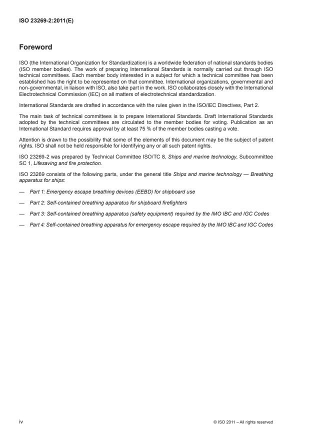 ISO 23269-2:2011 specifies self‑contained breathing apparatus (SCBA) intended for shipboard firefighters. It supplements SOLAS Chapter II‑2 and the IMO FSS Code by providing detailed technical and performance requirements for SCBA carried on ships. These devices are intended for use in fighting small to medium magnitude fires before fixed fire‑fighting systems operate; they are not suitable for direct entry into flames.