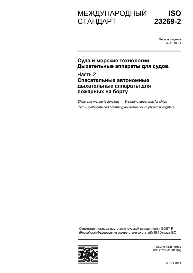 ISO 23269-2:2011 - Ships and marine technology — Breathing apparatus for ships — Part 2: Self-contained breathing apparatus for shipboard firefighters Released:1/22/2014