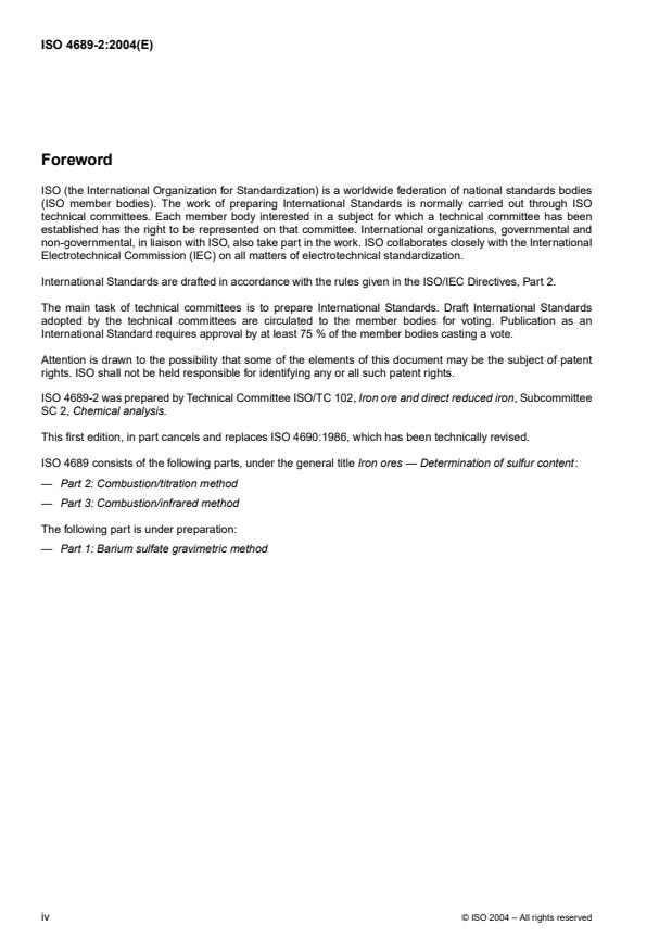 ISO 4689-2:2015 - Iron ores — Determination of sulfur content — Part 2: Combustion/titration method - Effective Date