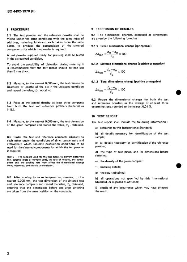 ISO 4492:1978 is a standard published by the International Organization for Standardization (ISO). Its full title is "Metallic powders, excluding powders for hardmetals — Determination of dimensional changes associated with compacting and sintering". This standard covers: Metallic powders, excluding powders for hardmetals — Determination of dimensional changes associated with compacting and sintering
