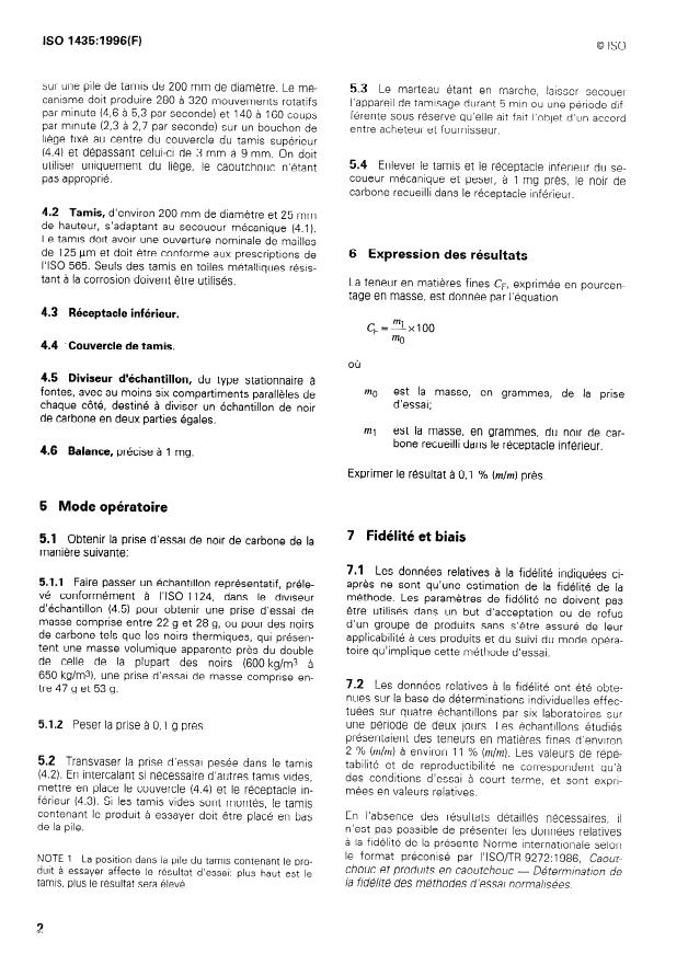 ISO 1435:1996 is the international standard that specifies a laboratory method for determining the fines content of pelletized (granulated) carbon black used in rubber compounding. Published in 1996 (fourth edition), it replaces the 1988 edition and describes the test that measures the fraction of a sample that will pass through a 125 µm nominal aperture sieve under defined mechanical shaking and hammering conditions.