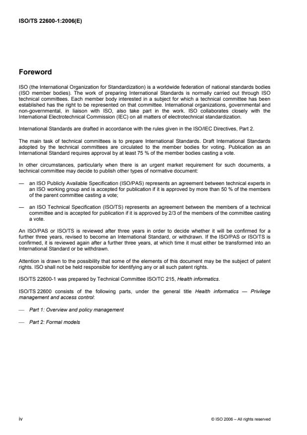 ISO/TS 22600-1:2006 is a technical specification published by the International Organization for Standardization (ISO). Its full title is "Health informatics — Privilege management and access control — Part 1: Overview and policy management". This standard covers: ISO/TS 22600-1:2006 is intended to support the needs of healthcare information sharing across unaffiliated providers of healthcare, healthcare organizations, health insurance companies, their patients, staff members and trading partners. It is also intended to support inquiries from both individuals and application systems. ISO/TS 22600-1:2006 supports collaboration between several authorization managers that may operate over organizational and policy borders.