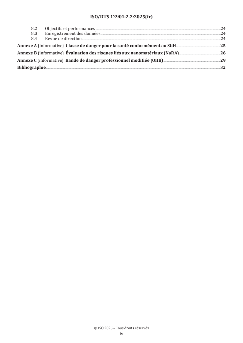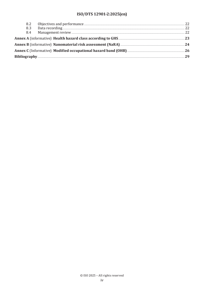 - Annexes and examples: informative annexes on GHS hazard classes, Nanomaterial Risk Assessment (NaRA), and a modified occupational hazard band (OHB) with examples and tool references.
