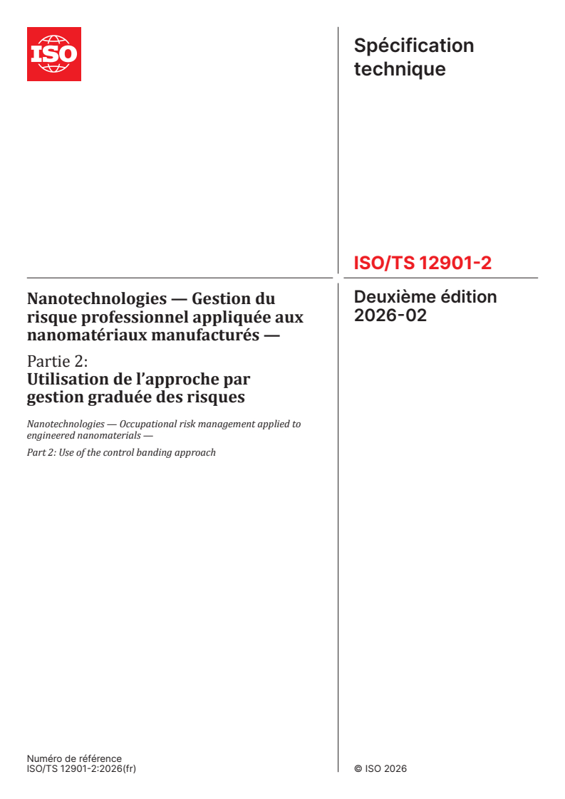 ISO/TS 12901-2:2026 - Nanotechnologies — Gestion du risque professionnel appliquée aux nanomatériaux manufacturés — Partie 2: Utilisation de l’approche par gestion graduée des risques