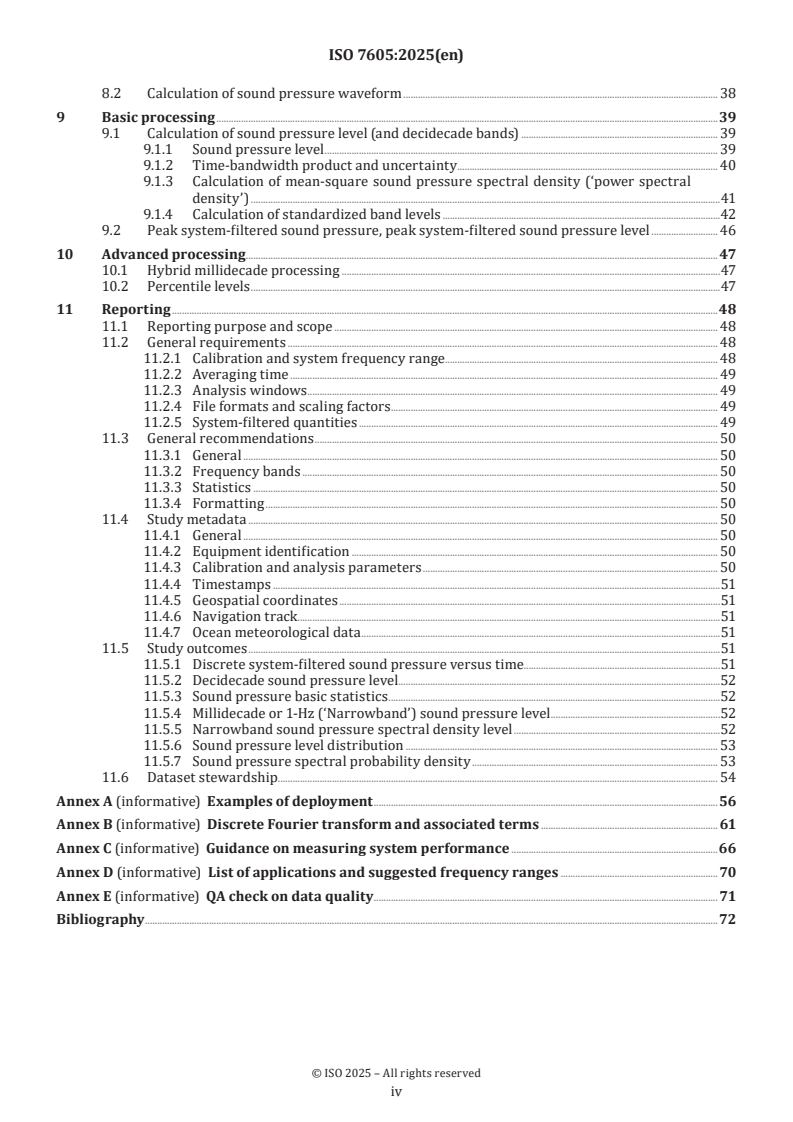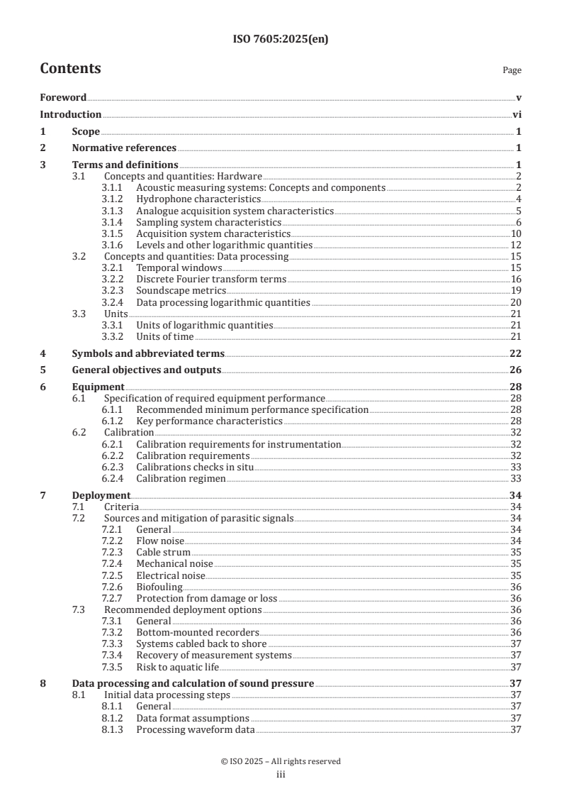 This document provides requirements and recommendations for measuring and reporting ambient sound in water, as characterized by sound pressure and selected quantities that can be derived from sound pressure. “Ambient sound” implies sound from any source except sources of self-noise. The scope includes equipment performance, calibration and deployment, digital data acquisition and data processing. Data processing is the process of converting raw data into a form and context necessary to be interpreted by people and computers. The scope includes data analysis and reporting of recordings of duration one day or longer. Five data processing stages are considered: raw digital acquisition data3), sound pressure time series, sound pressure level time series, sound pressure spectra and their statistics. The scope excludes measurement of particle motion. 3)The word data is generally used as a collective noun in this document; the plural form is reserved for cases where the constructive relationship to individual observations or measurements is to be emphasized.