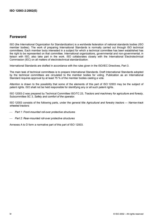 ISO 12003-2:2002 is a standard published by the International Organization for Standardization (ISO). Its full title is "Agricultural and forestry tractors — Narrow-track wheeled tractors — Part 2: Rear-mounted roll-over protective structures". This standard covers: ISO 12003-2 specifies procedures for both the static and dynamic testing of roll-over protective structures (ROPS) rear-mounted on narrow-track wheeled agriculture and forestry tractors. It defines the clearance zone and acceptance conditions for rigid or tiltable, rear, two-post rollbar, frame and cab ROPS, and is applicable to such tractors, so equipped, having the following characteristics: a ground clearance of not more than 600 mm beneath the lowest points of the front- and rear-axle housings (not considering lower points on the axle differential); a fixed or adjustable minimum track width of one of the two axles of less than 1 150 mm when fitted with the widest specified tyres, and with the overall width of the other axle being less than that of the first axle; a mass greater than 600 kg but less than 3 000 kg, unladen, including the ROPS and tyres of the largest size recommended by the manufacturer.