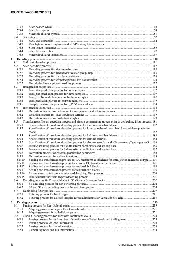 ISO/IEC 14496-10:2010 specifies advanced video coding for the coding of audio-visual objects. ISO/IEC 14496-10:2010 was developed in response to a growing need for higher compression of moving pictures for various applications such as digital storage media, television broadcasting, Internet streaming, and real-time audiovisual communication. ISO/IEC 14496-10:2010 specifies a coded video representation syntax and an associated decoding process that are suitable for use in a wide variety of applications and network environments. ISO/IEC 14496-10:2010 includes the specification of advanced video coding (AVC) and associated extensions to enable scalable video coding (SVC) and multiview video coding (MVC).