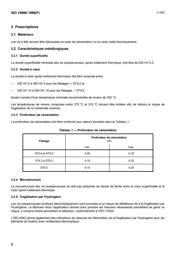 Keywords: ISO 10666, drilling screws, tapping screw thread, mechanical properties, surface hardness, case depth, torsional strength, hydrogen embrittlement.