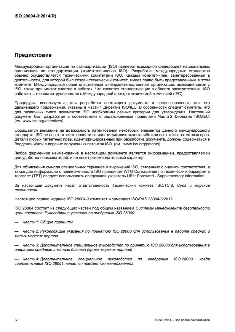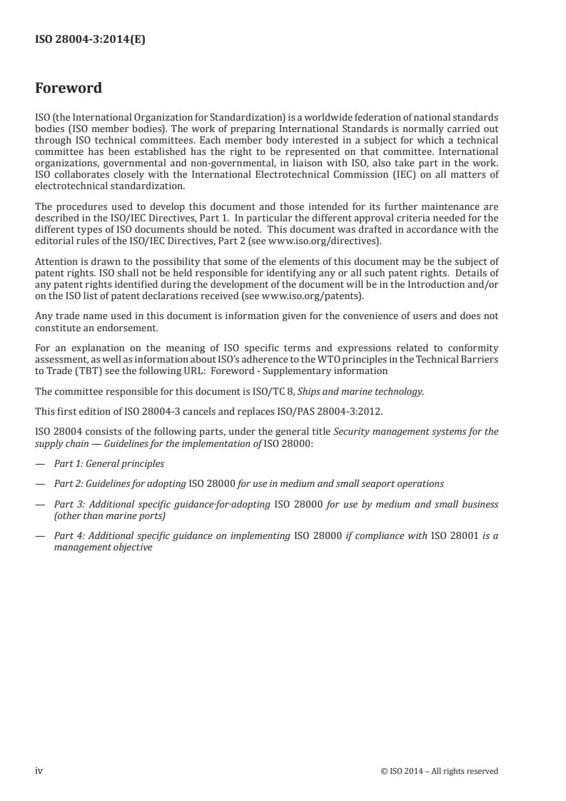 ISO 28004-3:2014 has been developed to supplement ISO 28004-1 by providing additional guidance to medium and small businesses (other than marine ports) that wish to adopt ISO 28000. The additional guidance in ISO 28004-3:2014, while amplifying the general guidance provided in the main body of ISO 28004-1, does not conflict with the general guidance, nor does it amend ISO 28000.