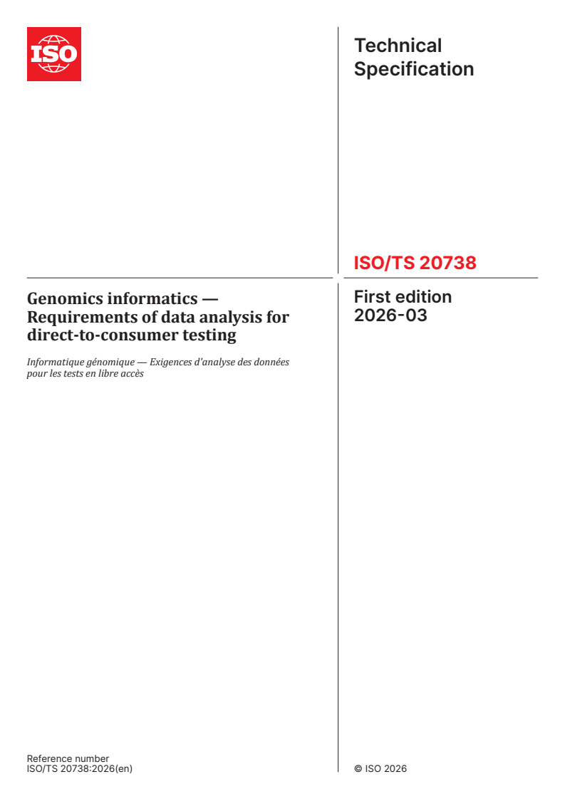 ISO/TS 20738:2026 is a technical specification published by the International Organization for Standardization (ISO). Its full title is "Genomics informatics — Requirements of data analysis for direct-to-consumer testing". This standard covers: This document specifies the requirements for genetic data analysis relating to direct-to-consumer (DTC) testing, including preprocessing, detection site, evaluation models, the use of databases and the elements of assessment reports. This document applies to the analysis of genetic data from DTC testing without the involvement of a health care provider.