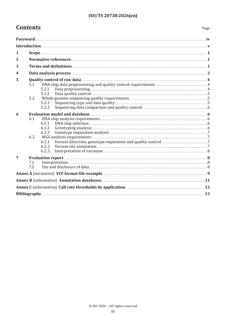 Keywords: ISO/DTS 20738, genomics informatics, direct‑to‑consumer testing, DTC, genotyping arrays, whole genome sequencing, VCF, FASTQ, quality control, genotype imputation, variant calling.