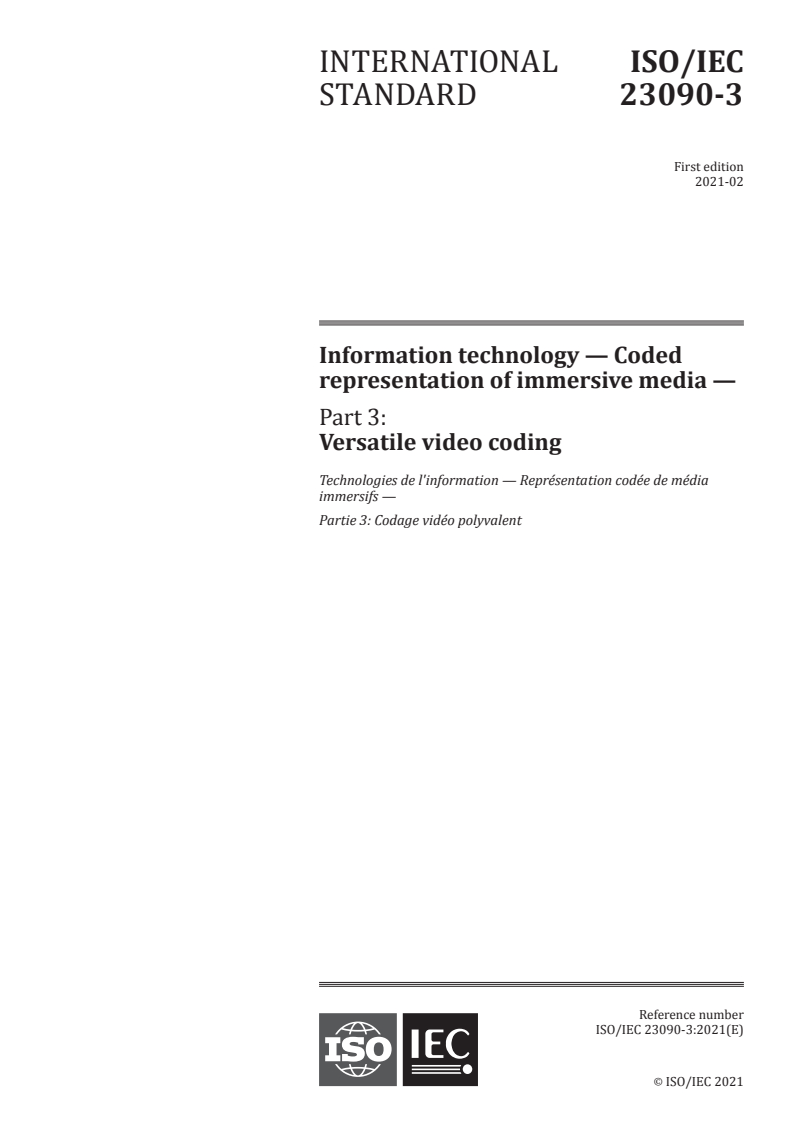 ISO/IEC 23090-3:2021 - Information technology — Coded representation of immersive media — Part 3: Versatile video coding Released:2/17/2021