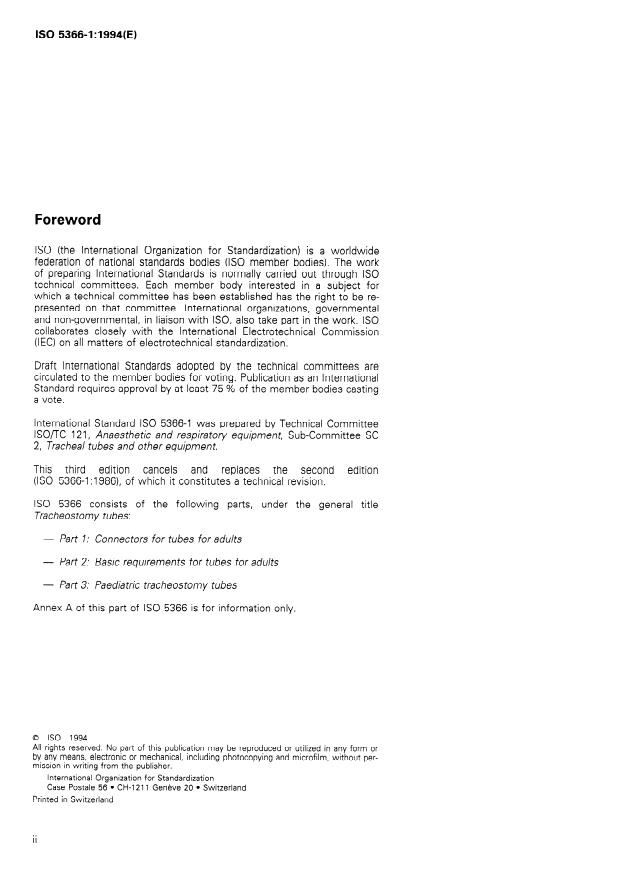 ISO 5366-1:1994 is a standard published by the International Organization for Standardization (ISO). Its full title is "Tracheostomy tubes — Part 1: Connectors for tubes for adults". This standard covers: Tracheostomy tubes — Part 1: Connectors for tubes for adults