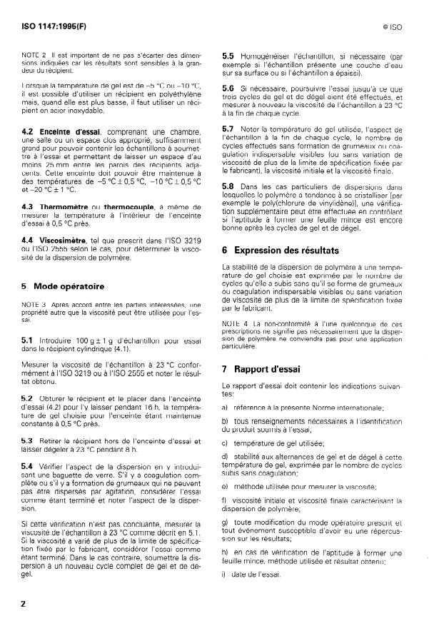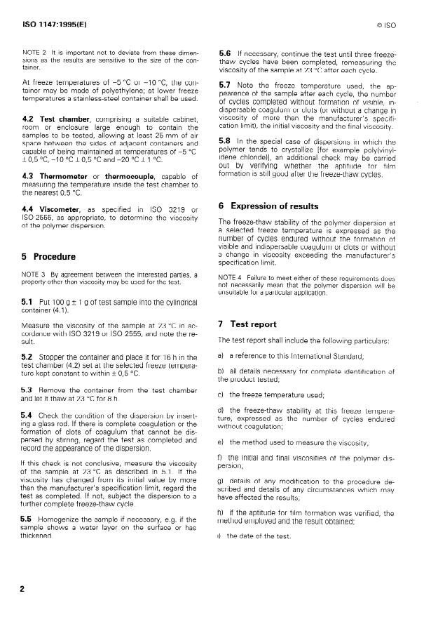 - Reporting: Test report must include reference to ISO 1147, product identification, freeze temperature used, method of viscosity measurement, initial and final viscosities, number of cycles, any modifications, and test date.