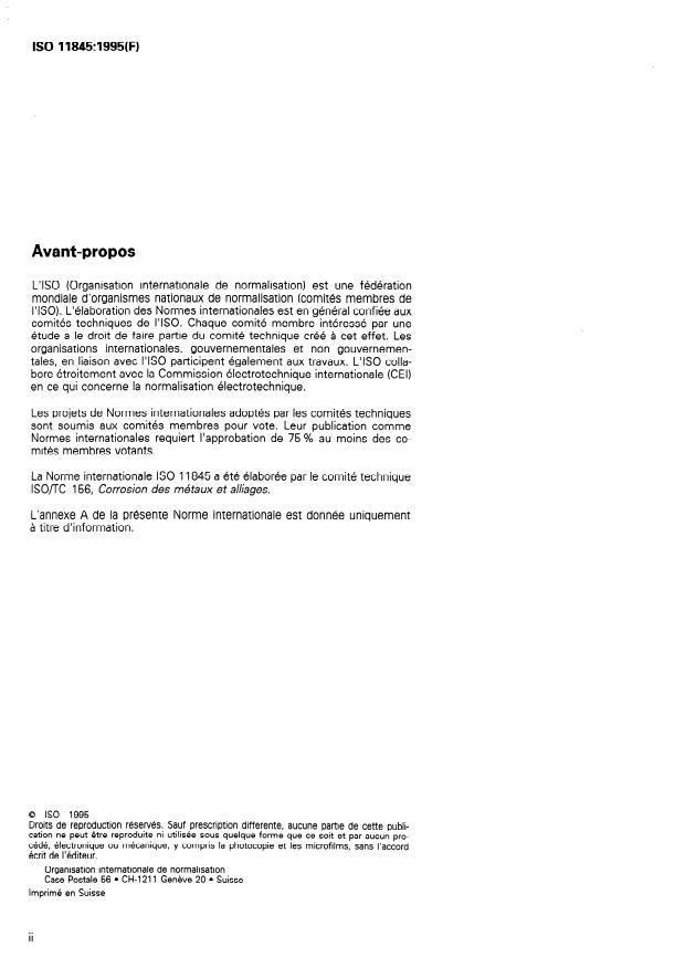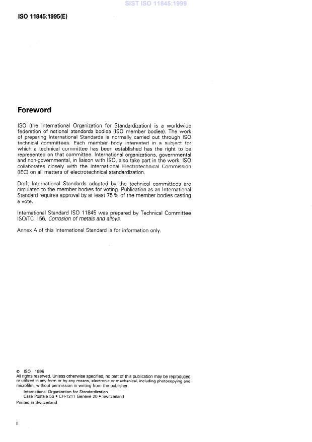 ISO 11845:1995 is a standard published by the International Organization for Standardization (ISO). Its full title is "Corrosion of metals and alloys — General principles for corrosion testing". This standard covers: Contains the most important general guidelines for carrying out corrosion test under conditions of constant immersion. Does not cover procedures for stress corrosion testing.