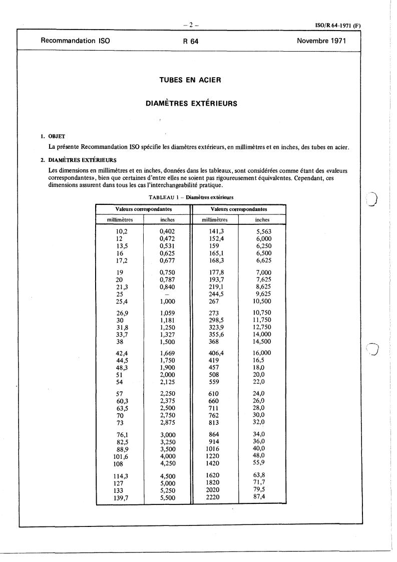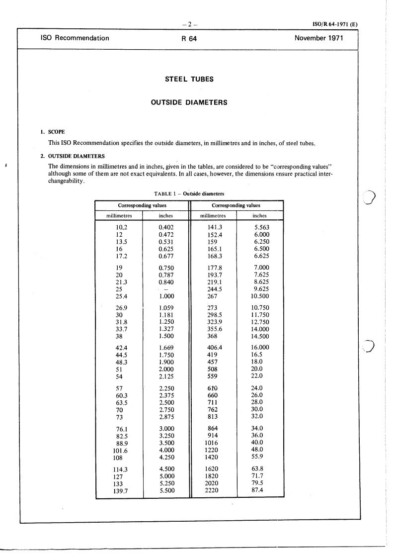 This IS0 Recommendation specifies the outside diameters, in millimetres and in inches, of steel tubes.