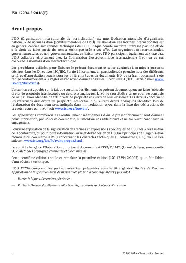 ISO 17294-2:2016 is a standard published by the International Organization for Standardization (ISO). Its full title is "Water quality — Application of inductively coupled plasma mass spectrometry (ICP-MS) — Part 2: Determination of selected elements including uranium isotopes". This standard covers: ISO 17294-2:2016 specifies a method for the determination of the elements aluminium, antimony, arsenic, barium, beryllium, bismuth, boron, cadmium, caesium, calcium, cerium, chromium, cobalt, copper, dysprosium, erbium, gadolinium, gallium, germanium, gold, hafnium, holmium, indium, iridium, iron, lanthanum, lead, lithium, lutetium, magnesium, manganese, mercury, molybdenum, neodymium, nickel, palladium, phosphorus, platinum, potassium, praseodymium, rubidium, rhenium, rhodium, ruthenium, samarium, scandium, selenium, silver, sodium, strontium, terbium, tellurium, thorium, thallium, thulium, tin, tungsten, uranium and its isotopes, vanadium, yttrium, ytterbium, zinc and zirconium in water (for example, drinking water, surface water, ground water, waste water and eluates). Taking into account the specific and additionally occurring interferences, these elements can also be determined in digests of water, sludges and sediments (for example, digests of water as described in ISO 15587‑1 or ISO 15587‑2). The working range depends on the matrix and the interferences encountered. In drinking water and relatively unpolluted waters, the limit of quantification (xLQ) lies between 0,002 µg/l and 1,0 µg/l for most elements. The working range typically covers concentrations between several pg/l and mg/l depending on the element and pre-defined requirements. The quantification limits of most elements are affected by blank contamination and depend predominantly on the laboratory air-handling facilities available on the purity of reagents and the cleanliness of glassware. The lower limit of quantification is higher in cases where the determination suffers from interferences (see Clause 5) or memory effects (see ISO 17294‑1:2004, 8.2).