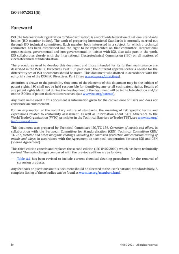 ISO 8407:2021 is a standard published by the International Organization for Standardization (ISO). Its full title is "Corrosion of metals and alloys — Removal of corrosion products from corrosion test specimens". This standard covers: This document specifies procedures for the removal of corrosion products formed on metal and alloy corrosion test specimens during their exposure in corrosive environments. For the purpose of this document, the term "metals" refers to pure metals and alloys. The specified procedures are designed to remove all corrosion products without significant removal of base metal. This allows an accurate determination of the mass loss of the metal, which occurred during exposure to the corrosive environment. In some cases, these procedures are also applicable to metal coatings, providing the possible effects from the substrate are considered.