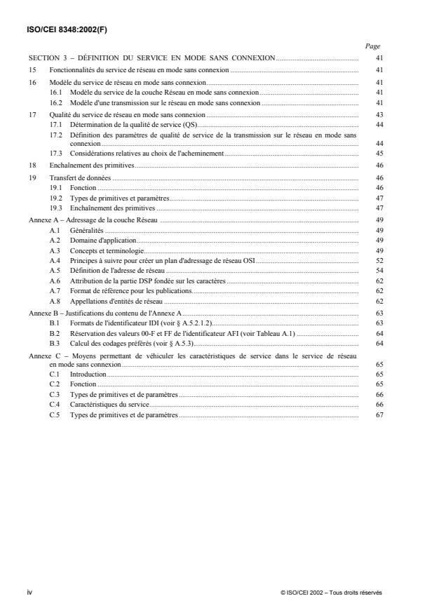 L'ISO/CEI 8348:2002 définit les services, en termes de définition du service abstrait, fournis par la couche Réseau à la couche Transport. Aux concepteurs de protocoles de la couche Transport, elle fournit une définition du service de réseau permettant la conception et la mise en oeuvre indépendamment des détails du protocole de la couche Réseau. Aux concepteurs de protocoles de la couche Réseau, elle définit les services devant être fournis par l'intermédiaire du protocole.