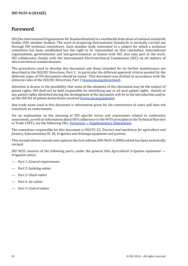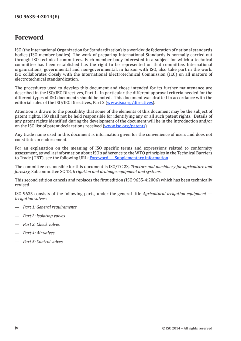 ISO 9635-4:2014 is a standard published by the International Organization for Standardization (ISO). Its full title is "Agricultural irrigation equipment — Irrigation valves — Part 4: Air valves". This standard covers: ISO 9635-4:2014 specifies construction and performance requirements and test methods for air valves, intended for operation in irrigation systems with water at temperatures not exceeding 60 °C, which can contain fertilizers and other chemicals of the types and concentrations used in agriculture. It is applicable to hydraulically operated air irrigation valves of DN 15 diameter or greater, designed to be directly operated, i.e. the force is applied to the obturator by the float, either directly or via a mechanical linkage. The valves can be operated by a force applied through an adjustable pilot valve.